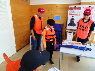 ライフジャケット着用体験をして頂きました。