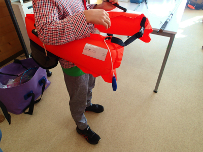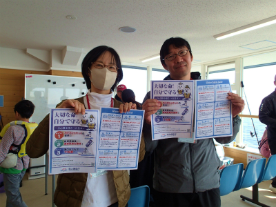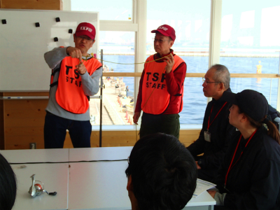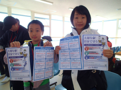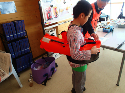 毎回、この教室では参加生徒様に実際にライフジャケット(手動式)を膨らませて、